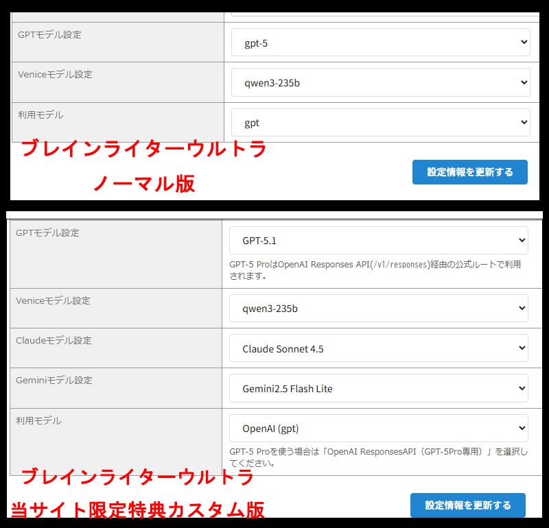 そこで、当サイト限定のカスタマイズ版ブレインライターウルトラでは現時点最強のAIモデル「GPT-5.1」を搭載したほか、アダルトジャンルにより柔軟な対応をするためのVeniceAIのモデルを追加搭載。